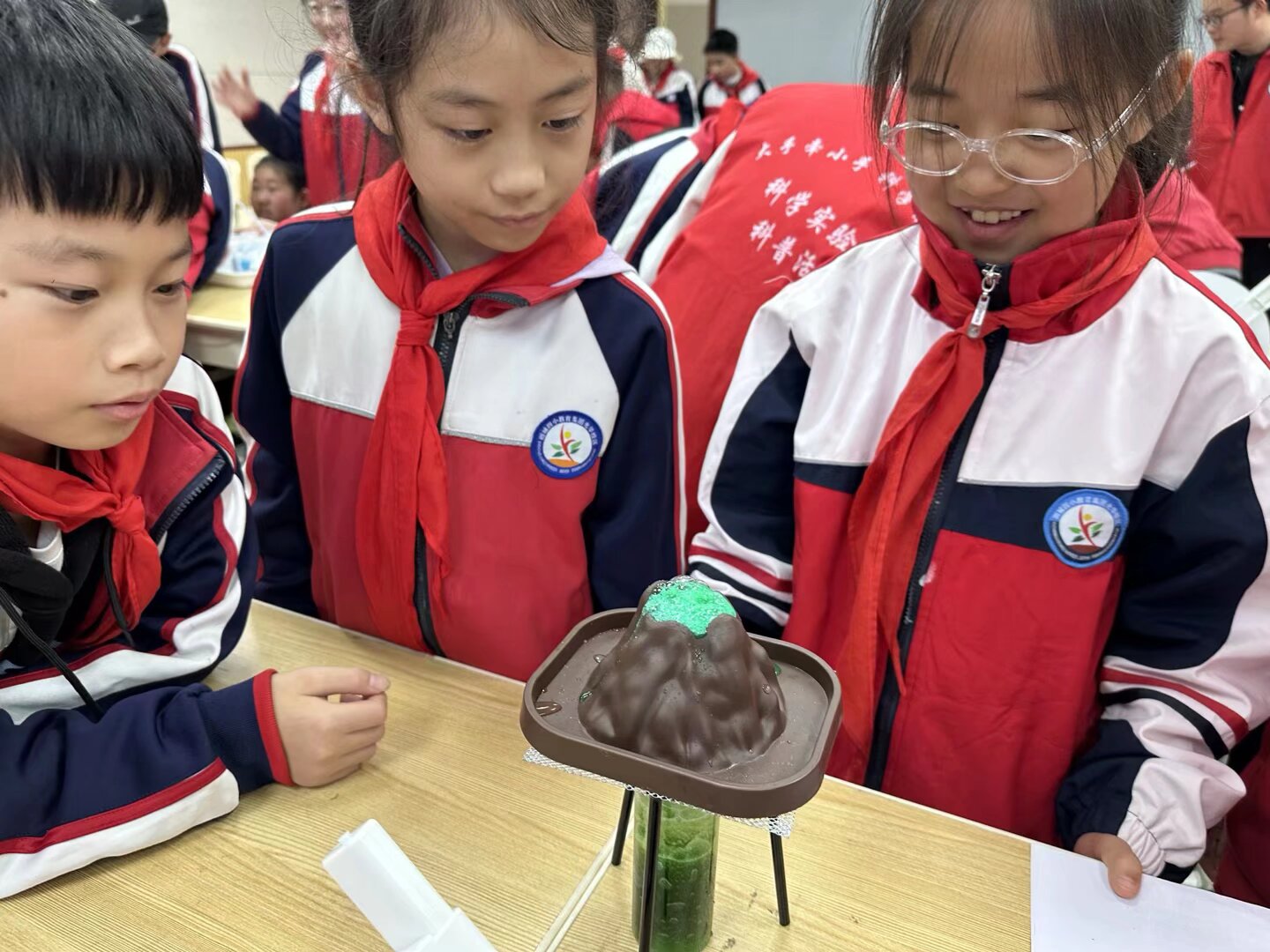 火山喷发实验现象生动有趣,用食用油和水的分层演示地质岩层,泡腾片遇水产生气泡来演示地壳岩浆涌动,小苏打和柠檬酸反应演示火山喷发现象,帮助学生直观理解地球内部能量释放的过程。实验中,孩子们观察到“岩浆”喷涌而出的瞬间,纷纷发出惊叹,激发了浓厚的科学兴趣。