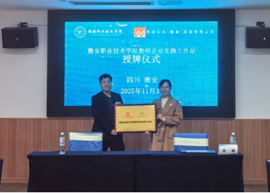 人事处处长刘永恩为华润三九(雅安)药业有限公司授予"雅安职业技术学院教师企业实践工作站"牌匾。此前,我校已与华润三九相继挂牌成立"数智医药技术培训基地"、"野生中药材繁育研究基地"、"雅安职业技术学院企业教师流动站"、"雅安职业技术学院企业教师科技服务站"。