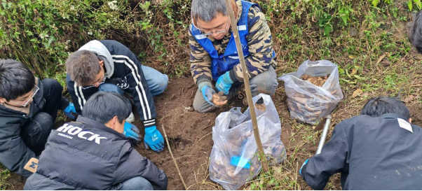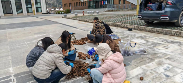 本次采收地块为 2025 年 4 月 23 日双方合作试种的试验田,试验种植面积约3.5 平方米,采用雅药工作室定制的高原版天麻仿野生种植技术。采挖现场,刘德军首先向师生讲解仿野生天麻采挖的核心要点,强调需遵循 “先轻刨表层土、再顺菌材轨迹挖掘” 的原则,避免损伤天麻块茎,影响天麻商品性状。在实操环节,师生们分组作业,先清理种植塘表层覆盖的腐殖土与落叶,再逐步剥离菌材周边土壤。随着菌材的取出,饱满的天麻块茎逐渐显露,其表皮色泽鲜亮、形体规整。整个采挖过程中未出现块茎破损的情况,实现了科学采挖的预期目标。同时,在采挖现场进行了助农兴农、产业助力乡村振兴等课程思政教育。