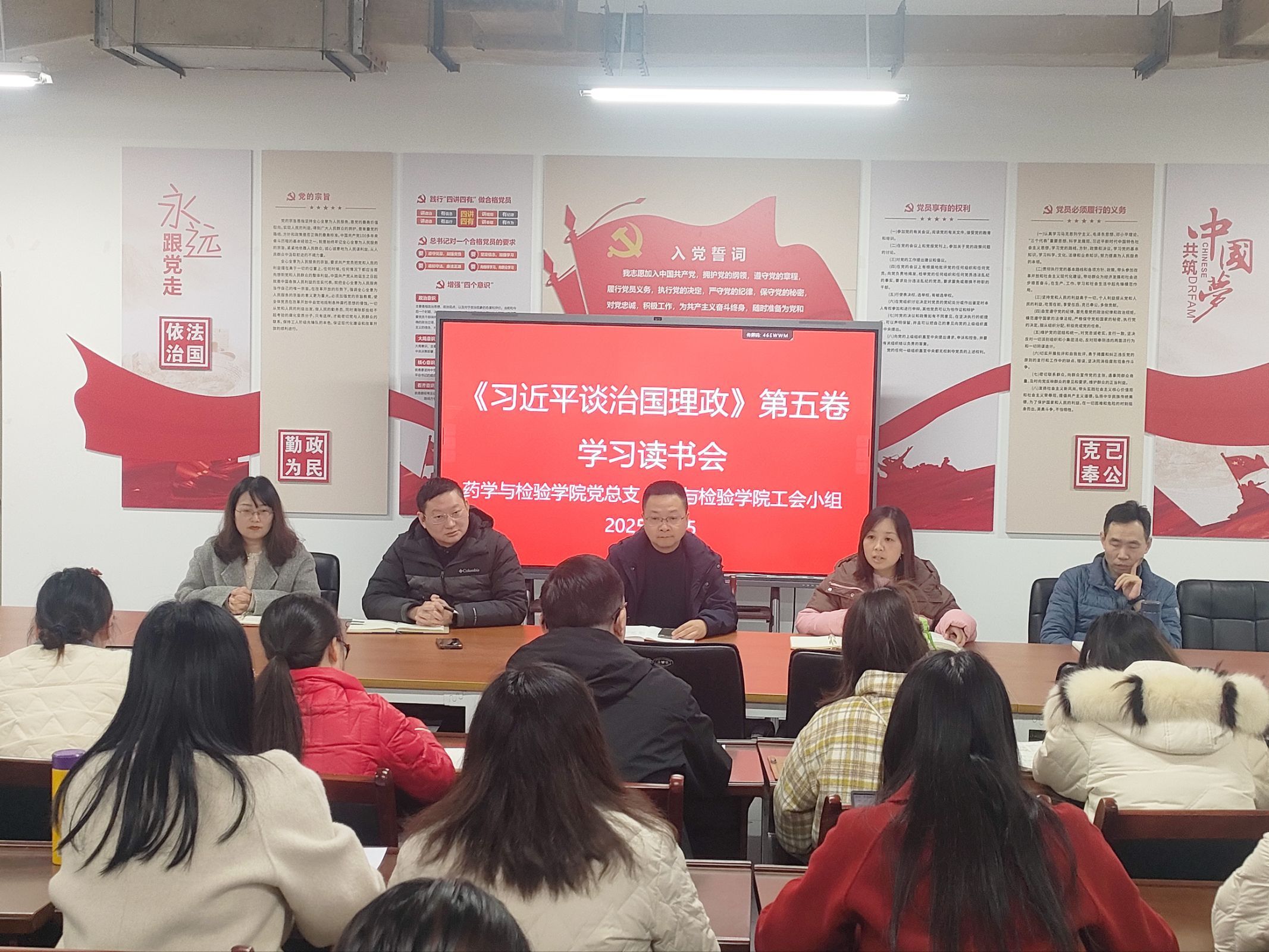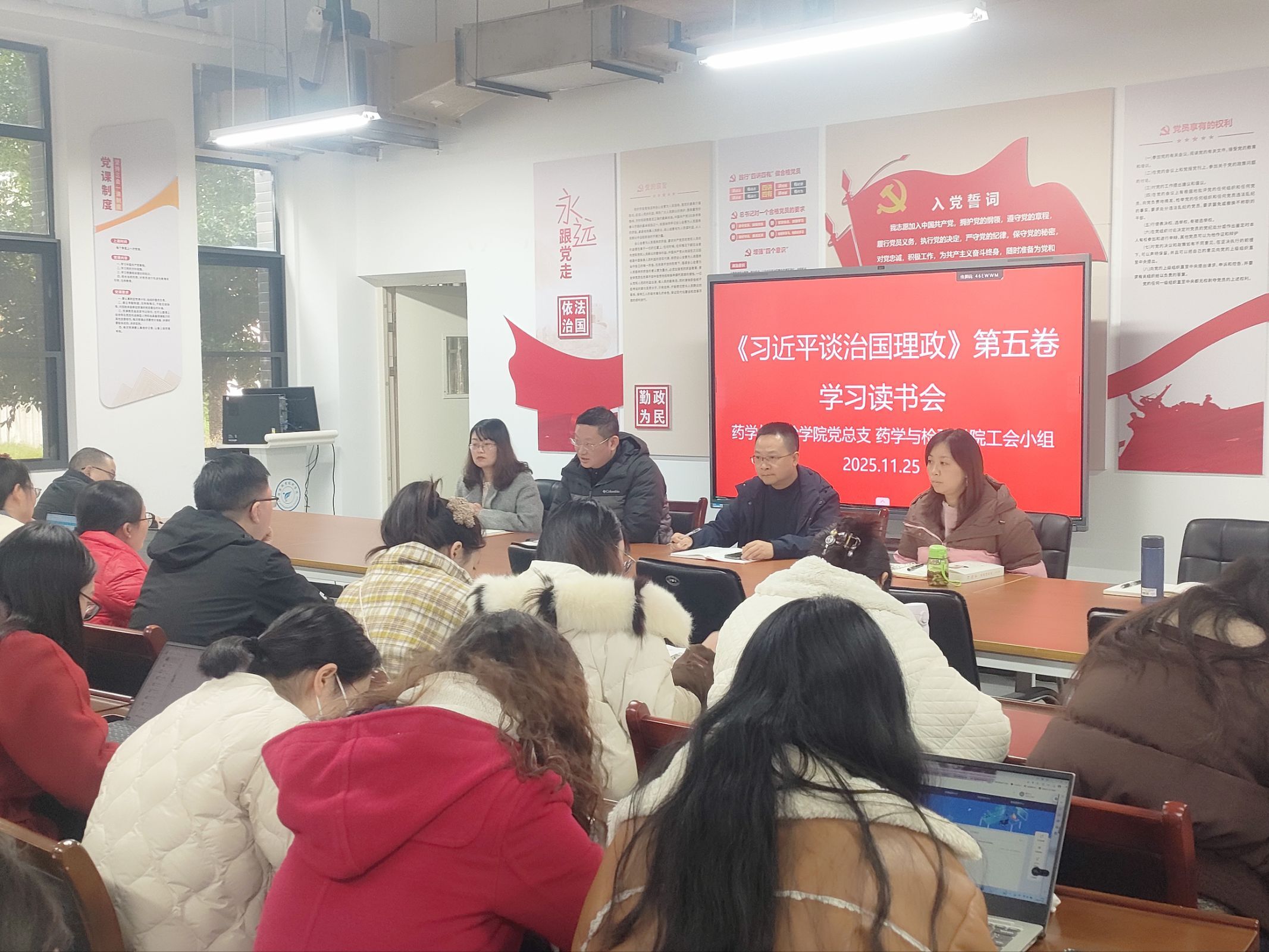 为深入学习贯彻习近平新时代中国特色社会主义思想,切实推动理论学习与专业实践深度融合,2025年11月25日药学与检验学院工会小组联合药学与检验学院党总支在经开校区药学与检验楼105会议室,组织全院61名教职工开展《习近平谈治国理政》第五卷学习读书会。