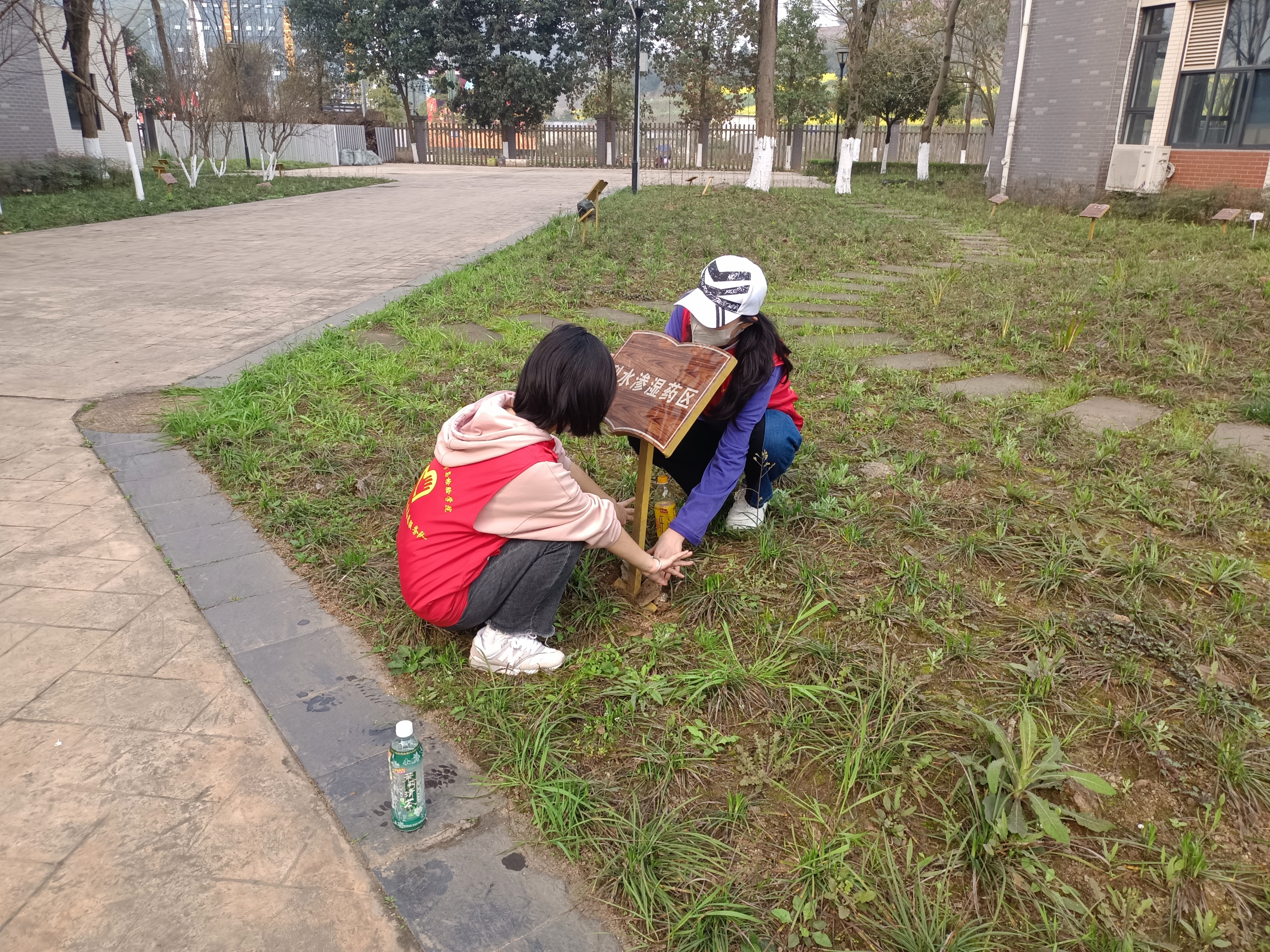本次活动以小组形式开展,18名身穿红色马甲的志愿者分为三组,活动分为三个环节,环节一:变废为宝,志愿者们提前收集用过的塑料瓶,在瓶盖上扎上小洞,自制成简易的浇水工具;环节二:废物利用,志愿者们在经开校区药检学院实训基地附近的中草药区,通过改造浇水装备为正在茁壮成长的中草药浇水;环节三:绿色加固,志愿者们分组分区域清理中草药区的白色垃圾及杂草,同时也为不牢固的指示牌做了加固工作。