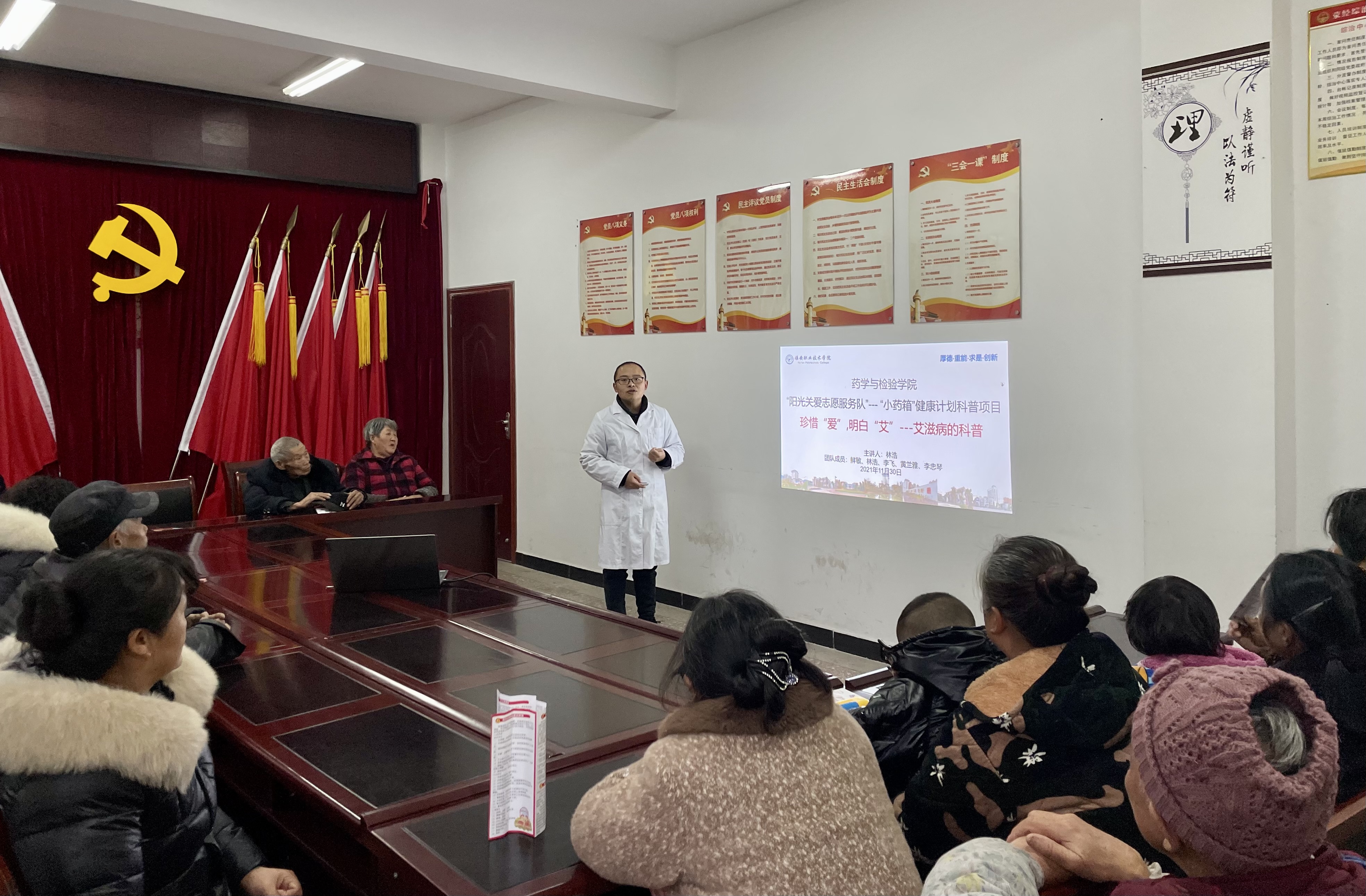 为了迎接世界艾滋病日的来临,进一步宣传和普及健康保健知识,增强社区民众对艾滋病等疾病的认识,减少疾病传播,11月30日,药学与检验学院阳光关爱志愿服务队10名志愿者在药检学院团总支书记鲜敏、专业指导老师林浩、李飞,党员教师马春兰的带领下前往雅安市荥经县宝峰彝族乡莲池村、新添镇上坝村、石龙村开展健康知识进社区科普宣传活动。