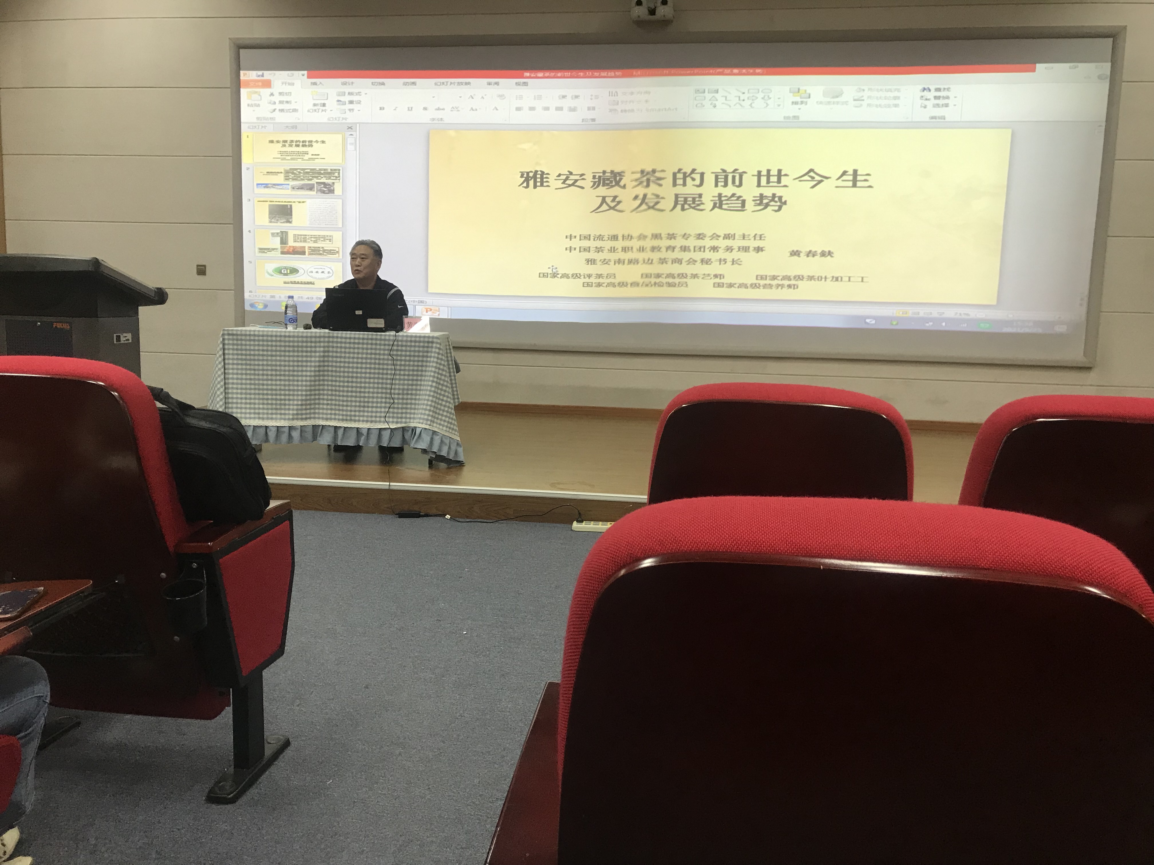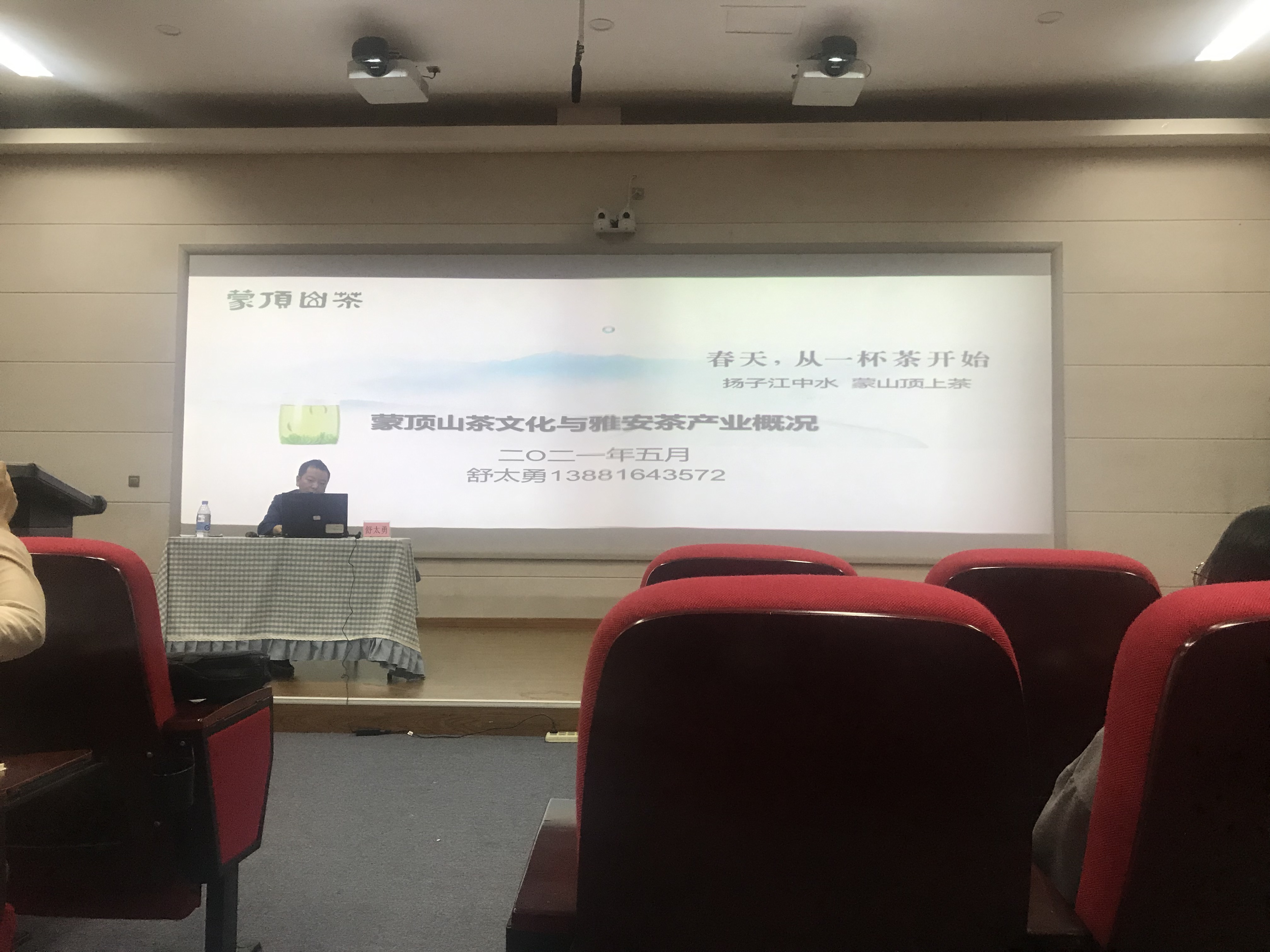 同时,蒙顶山茶叶交易所有限公司部门总经理舒太勇作了《蒙顶山茶文化及雅安茶产业概况》的报告,从蒙顶山茶的历史渊源到茶叶的品种门类、再到茶叶的营销,舒经理娓娓道来,让全校师生对蒙顶山茶有了更系统、深刻的认识。