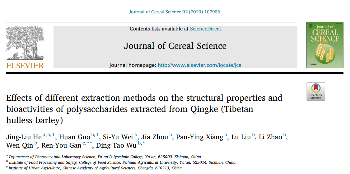 近日,我院何靖柳老师在植物源食物中功能性成分的提取研究方面取得新进展,相关成果以题为“Effects of different extraction methods on the structural properties and bioactivities of polysaccharides extracted from Qingke (Tibetan hulless barley)”发表于SCI期刊《Journal of Cereal Science》(影响因子:2.452)。雅安职业技术学院为第一单位,何靖柳老师为论文第一作者。