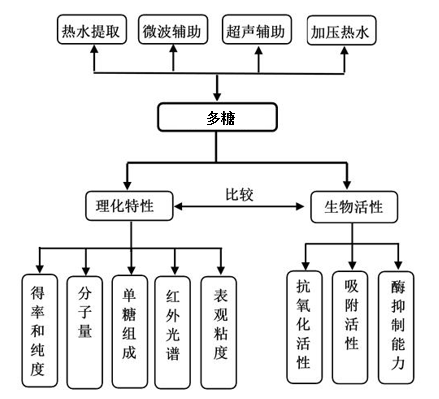 多糖是植物源食物中功能性物质,具有多种重要的生物活性,例如降血脂、降血糖、抗氧化、抗癌和抗炎作用,这些活性通常与其化学组成、流变特性和分子结构等密切相关;同时,天然多糖的提取产量、结构特征和生物学活性受提取方法的影响显著;为此,选择适当的多糖提取方式显得尤为重要。课题组采用多种提取方式分别对植物源样品中功能性多糖进行提取得率、结构表征及活性测定,确定最优提取方式。