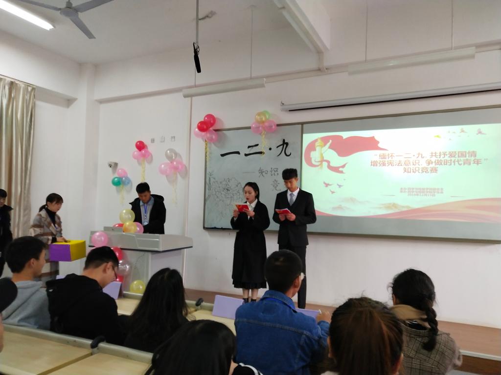 为加强学生爱国主义思想教育,引导大学生继承和发扬光荣的革命传统,同时深入学习近平总书记“依宪执政、依宪行政”的法治精神。12月15日下午2.30在经开区校区1103教室,药学与检验学院学生会举办了“缅怀12·9,共抒爱国情,争做懂法新青年”为主题的知识竞赛,共100余人参与了本次活动。