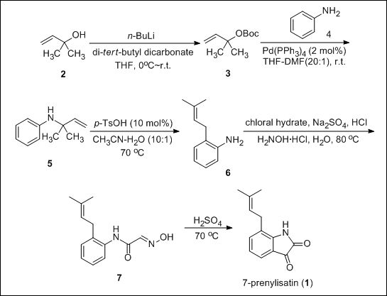 具有重要生物活性的天然产物分子的合成研究一直是药物化学,合成化学领域研究的热点,为寻找先导药物提供重要来源。具有重要抗菌活性的天然活性分子7-prenylisatin于2015年荷兰莱顿大学科学家在菌Streptomycessp. MBT28中分离得到,关于该活性分子的合成研究鲜见报道。