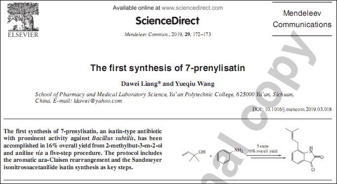 近日,我院梁大伟老师在天然活性分子合成研究方面取得新进展,相关成果以题“The first synthesis of 7-prenylisatin”发表于SCI刊物《Mendeleev Communications》(Mendeleev Commun., 2019,29, 172–173. DOI: 10.1016/j.mencom.2019.03.018)(影响因子:2.098)。雅安职业技术学院为第一单位,梁大伟副教授为论文第一作者/通讯作者。