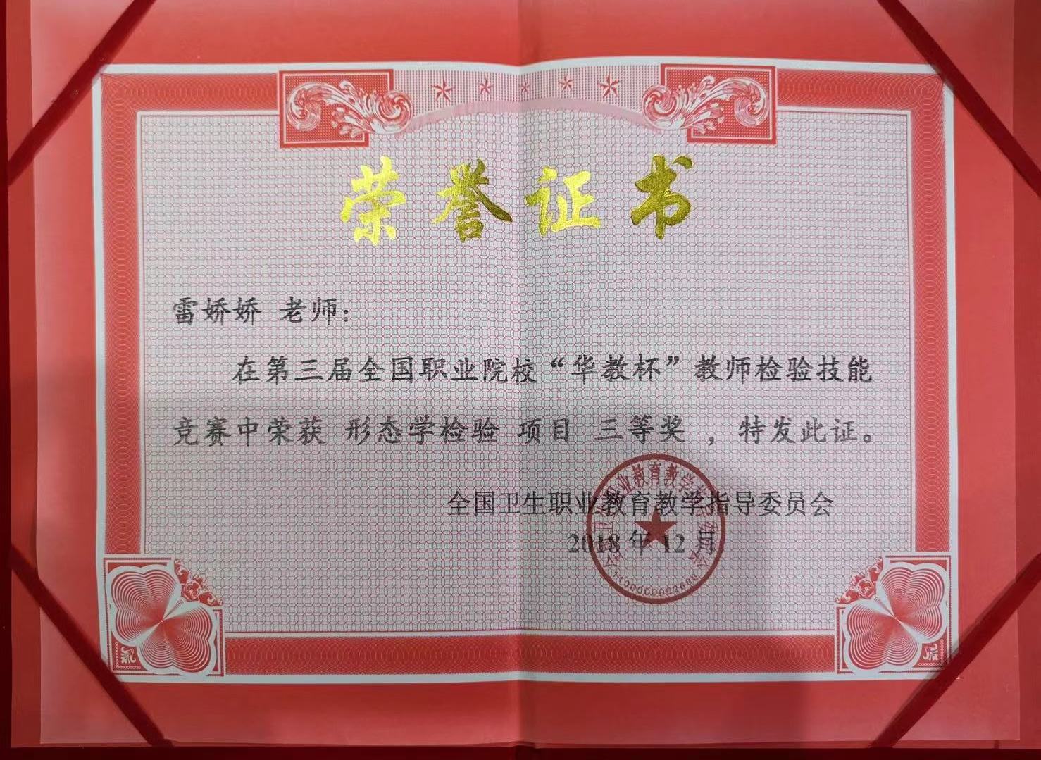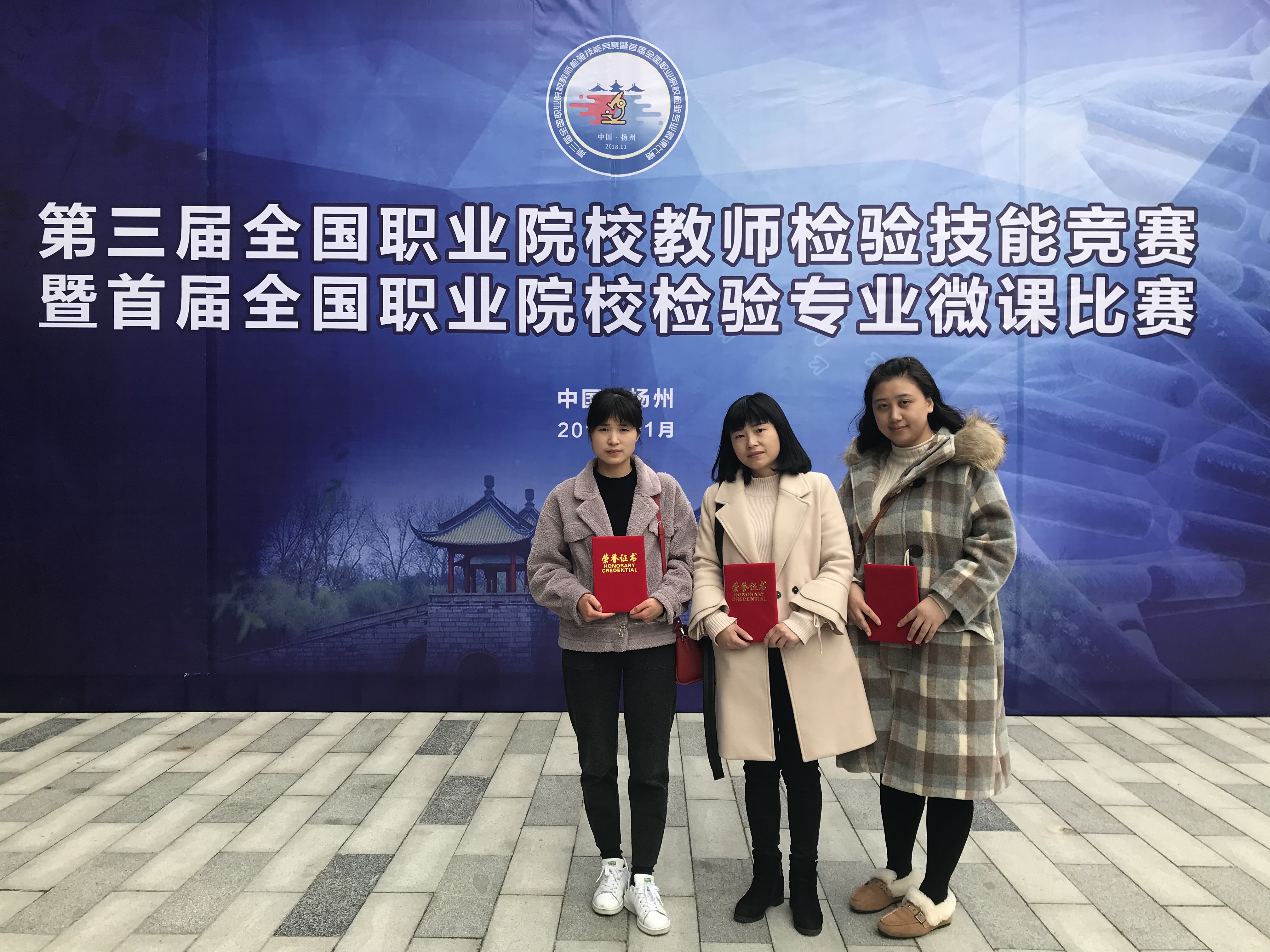 2018年11月29日,全国卫生职业教育教学指导委员会举办的第三届全国职业院校“华教杯”教师检验技能竞赛在扬州职业大学举行。本次比赛采用手工法操作,共设有血液常规检验、生化检验、细菌分离技术与革兰染色及细菌鉴定思路、形态学检验及骨髓片观察诊断、免疫学检验共5个项目,我院教师雷娇娇、陆小琴、康雪三位老师分别获得形态学检验及骨髓片观察诊断三等奖、免疫学检验优秀奖、血液常规检验优秀奖。