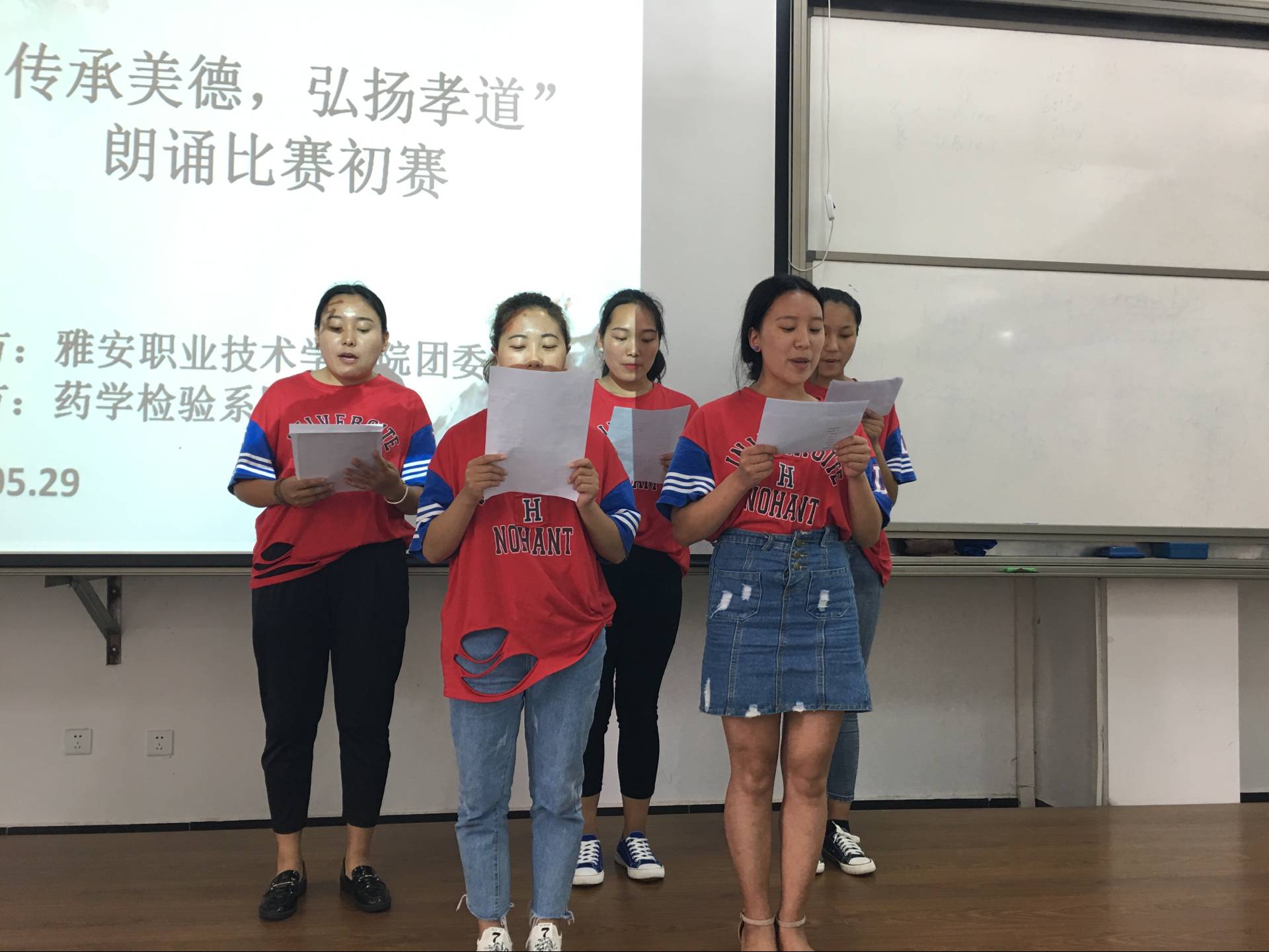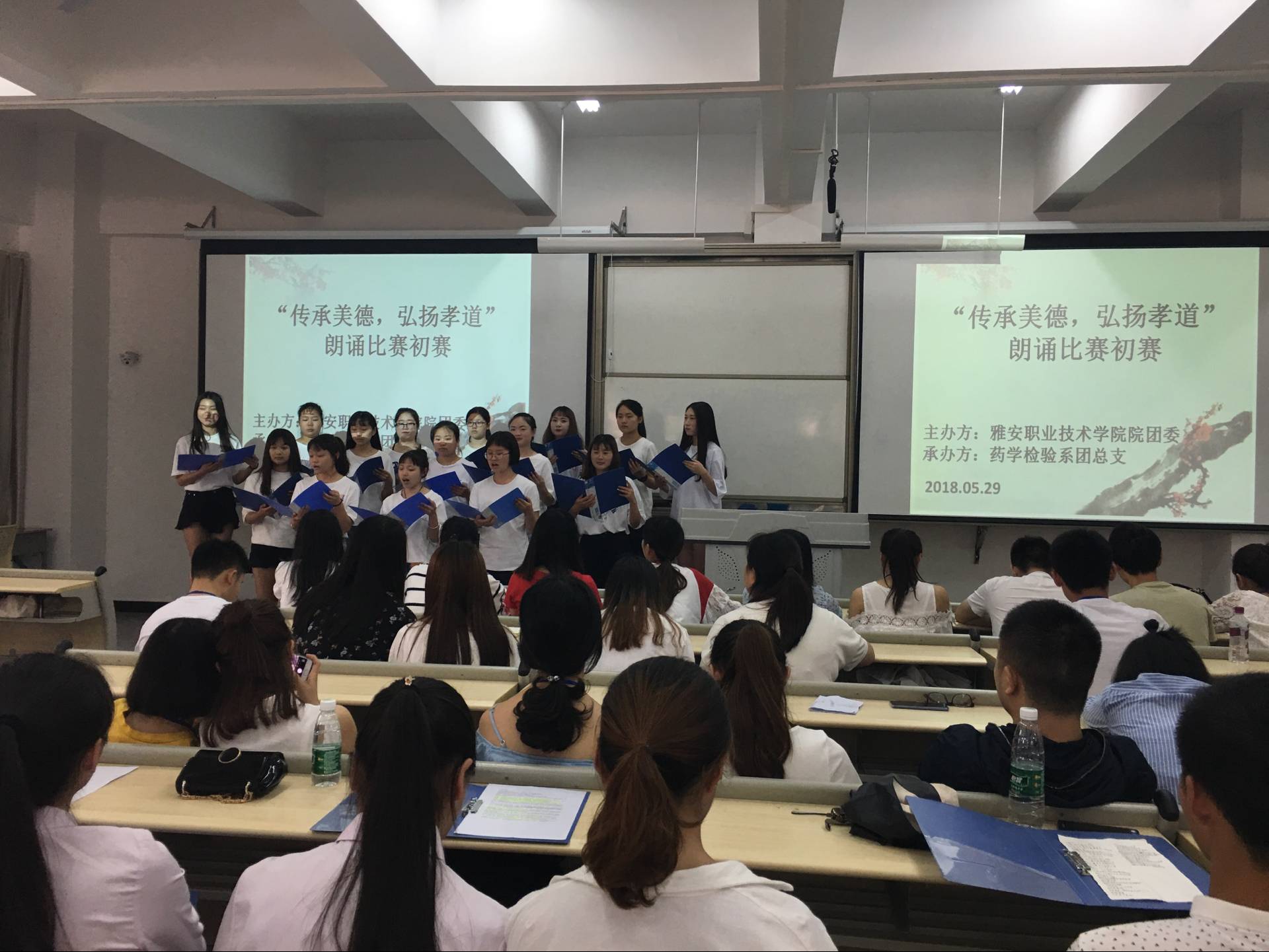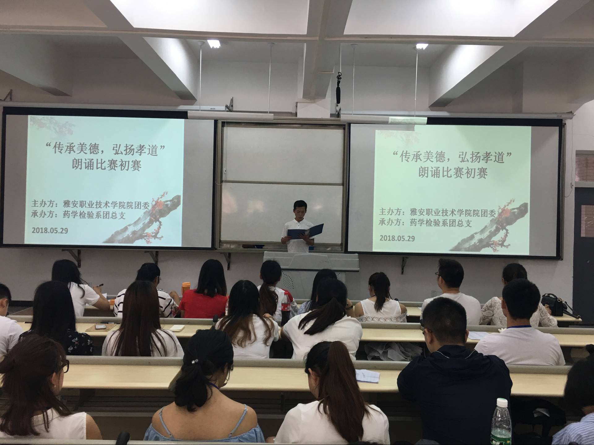 孝,天之经也,地之义也,德之本也,人之行也。为了弘扬中华美德,加强学生的思想道德教育,药检系团总支承办了院“传承美德,弘扬孝道”的朗诵比赛。5月29日下午13:00,朗诵比赛初赛在1104教室拉开序幕。药检系团总支书记鲜敏老师、团总支副书记陈静老师、学生会干部以及来自教育系、护理系、药检系的24组参赛团队参加了此次比赛。