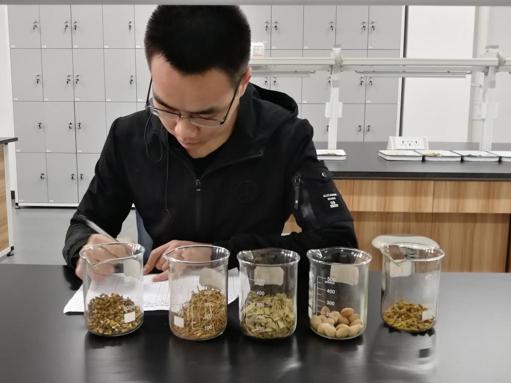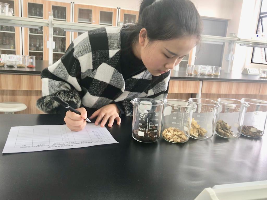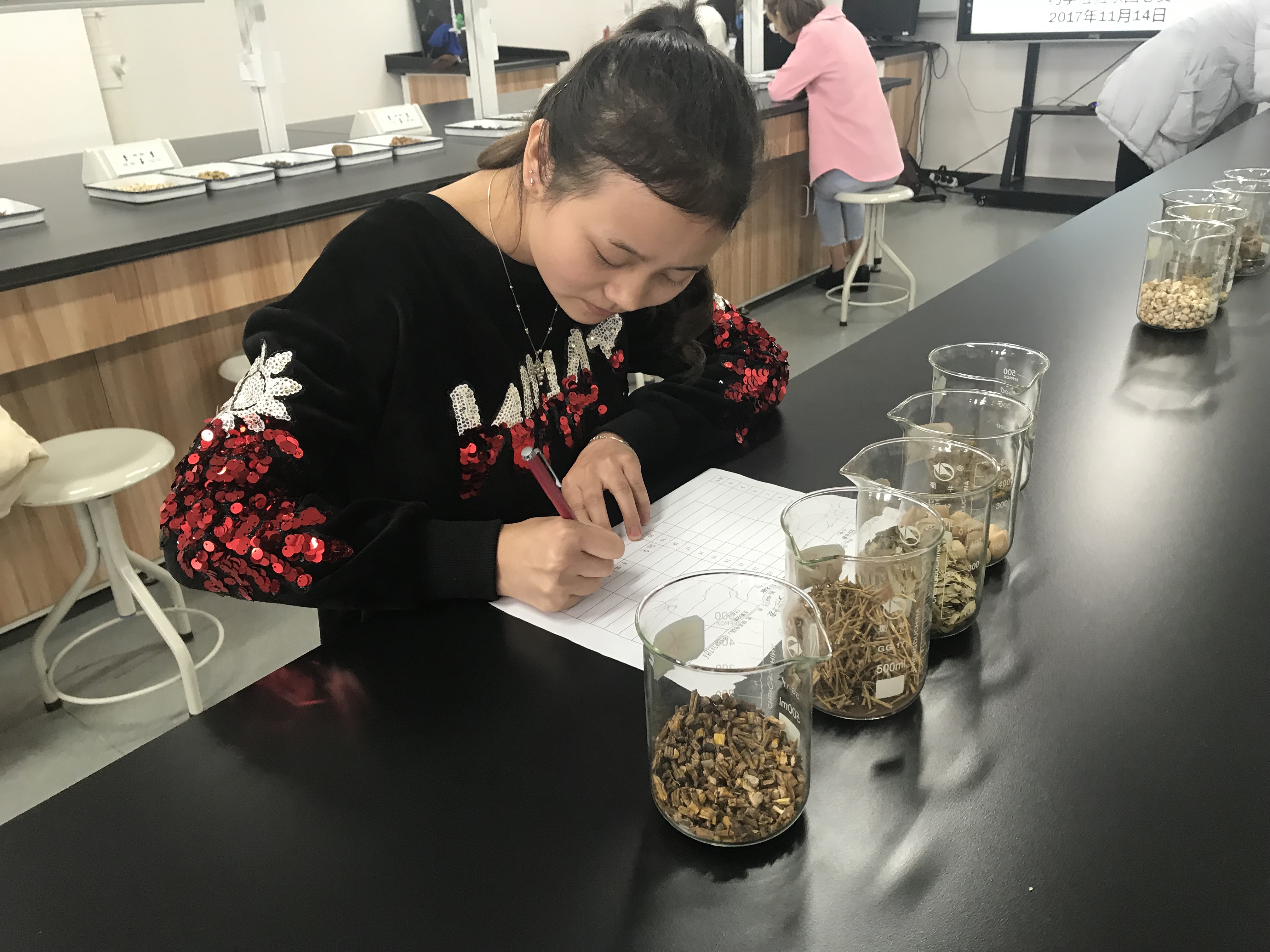 比赛按照国家中药传统技能大赛的流程进行,分为理论知识和实际操作两个环节。理论考试占总成绩40%,实际操作占60%。参赛选手先在1104教室进行理论考试,大家都认真仔细的答题,专心致志的书写着自己对中药的喜爱。理论考试完成后,由工作人员统一带队至中药鉴定实训室905进行实际操作。每4人一组同时进入实训室鉴别中药材。每位选手限时8分钟内答出药材的名字和功效。参赛者通过对药材的“望、闻、感、尝”等方式判断是何种药材。截止下午16:00,本次大赛圆满落下帷幕,中药16级1班商杰同学夺得冠军,药学、中药等专业同学进入前20名。