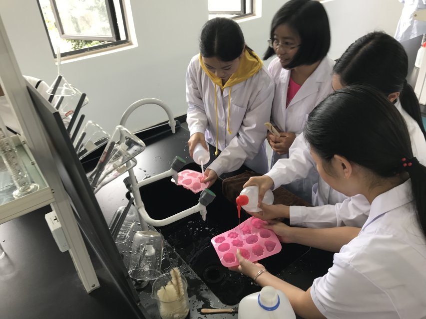 由于实验室的容纳量限制,每个班级只推选了12名同学参加,共计40余人参加。同学们在老师的指导下,按照步骤称量材料、融合搅拌,放入不同功效、不同味道的精油、花草等添加物。然后根据自己的喜好选择形状各异的模具,并将搅拌好的皂液倒入模具中静置冷却。不一会儿,精美的手工皂就诞生了。