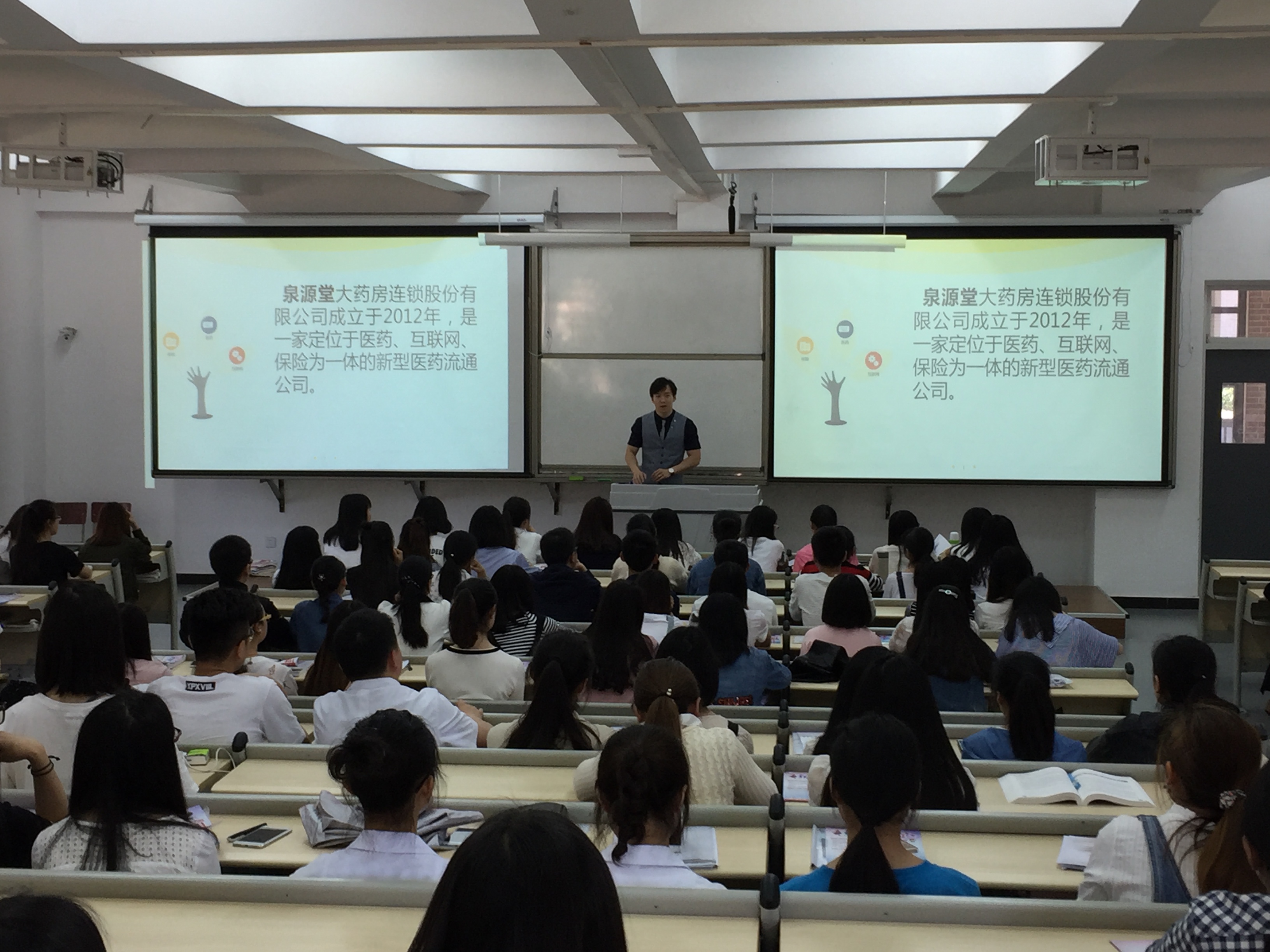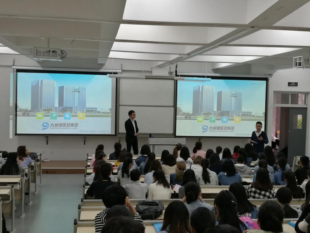 四川九州通医药有限公司、神鹤药业、迪安诊断、蓉药集团、科伦达制药(新都)、金利医贸、泉源堂、海王星辰、大家医学检验九家企业的代表来到我院为学生进行了企业文化宣讲,并结合当前的就业形式,分析企业所需人才应具备的医药知识及就业技能。