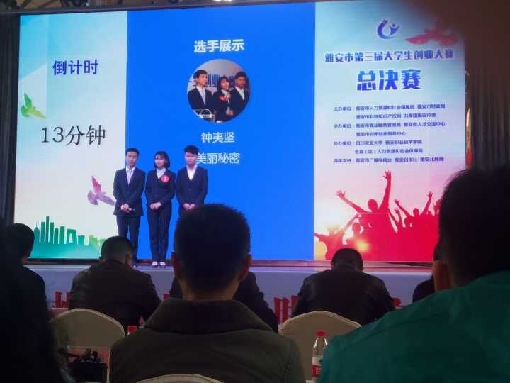 11月9日下午,雅安市第三届大学生创业大赛总决赛在名山区举行。我系10名在校大学生组成的 “美丽秘密” 创业团队首次参赛,经过紧张的角逐,获得本次大赛二等奖。