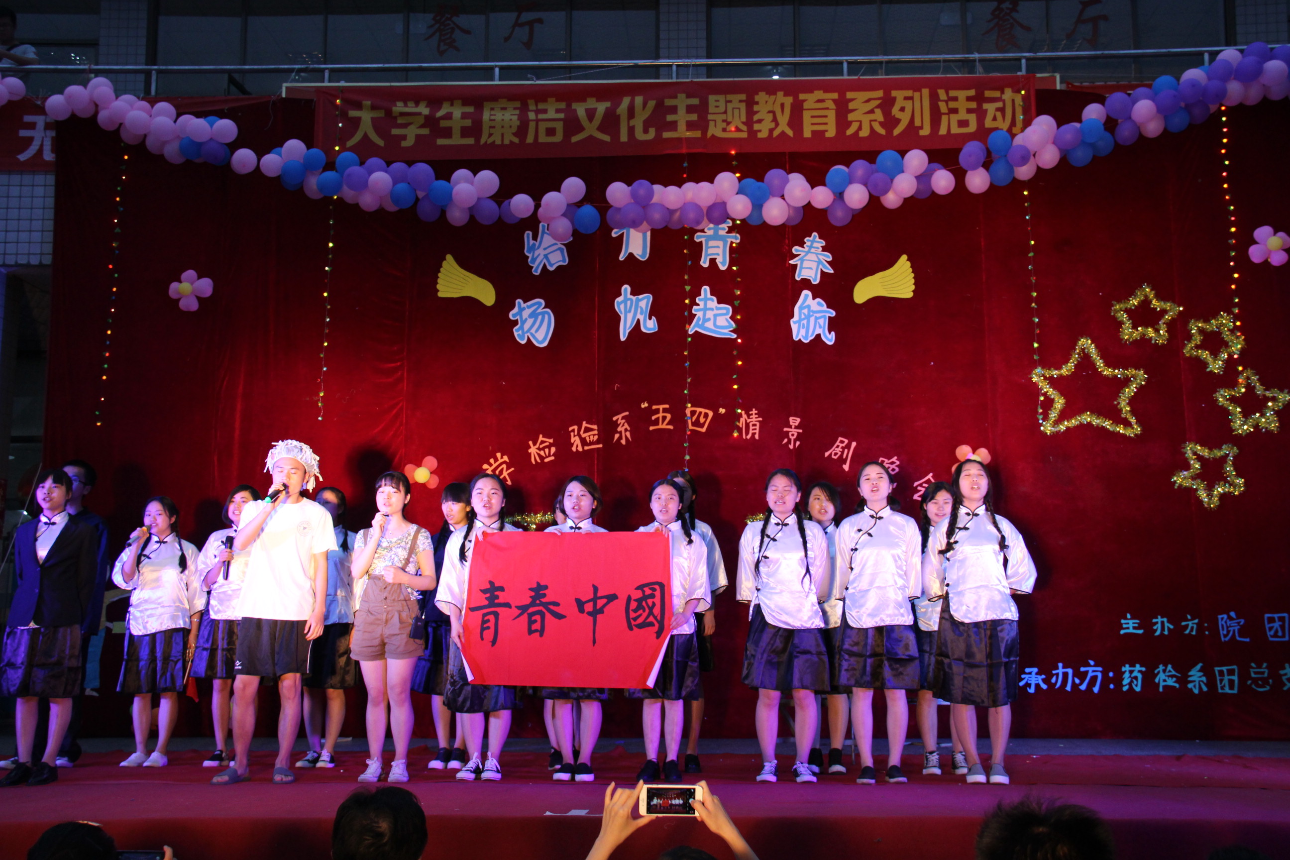 为进一步拓展学生综合素质,开展大学生廉洁文化主题教育活动,加强学生的思想政治教育,引导激励团员青年继承“五四”运动的光荣传统,大力弘扬“五四”精神,增强学生的责任感和使命感。2016年5月16日晚,药检系情景剧比赛晚会在万众瞩目中拉开了序幕。