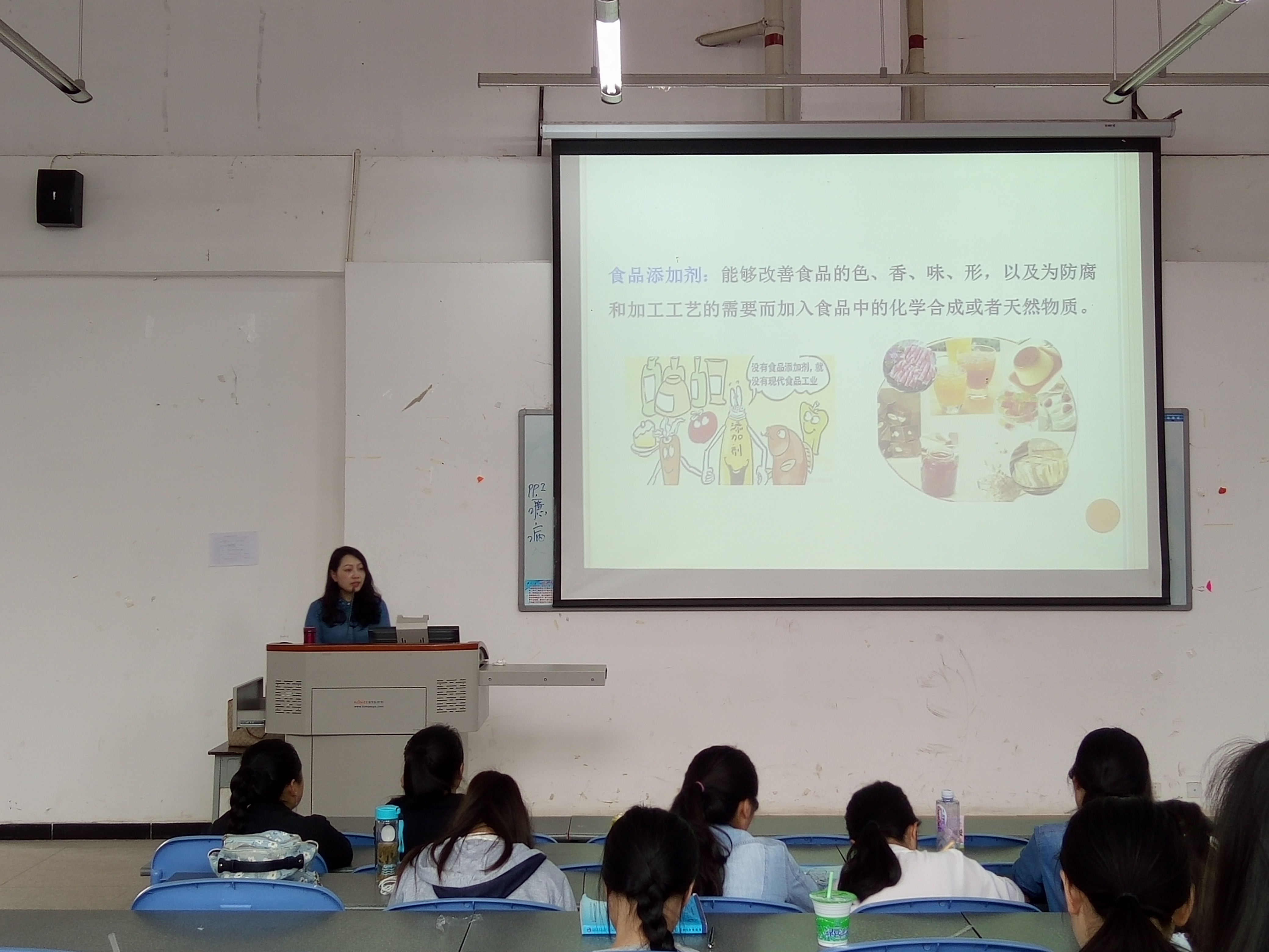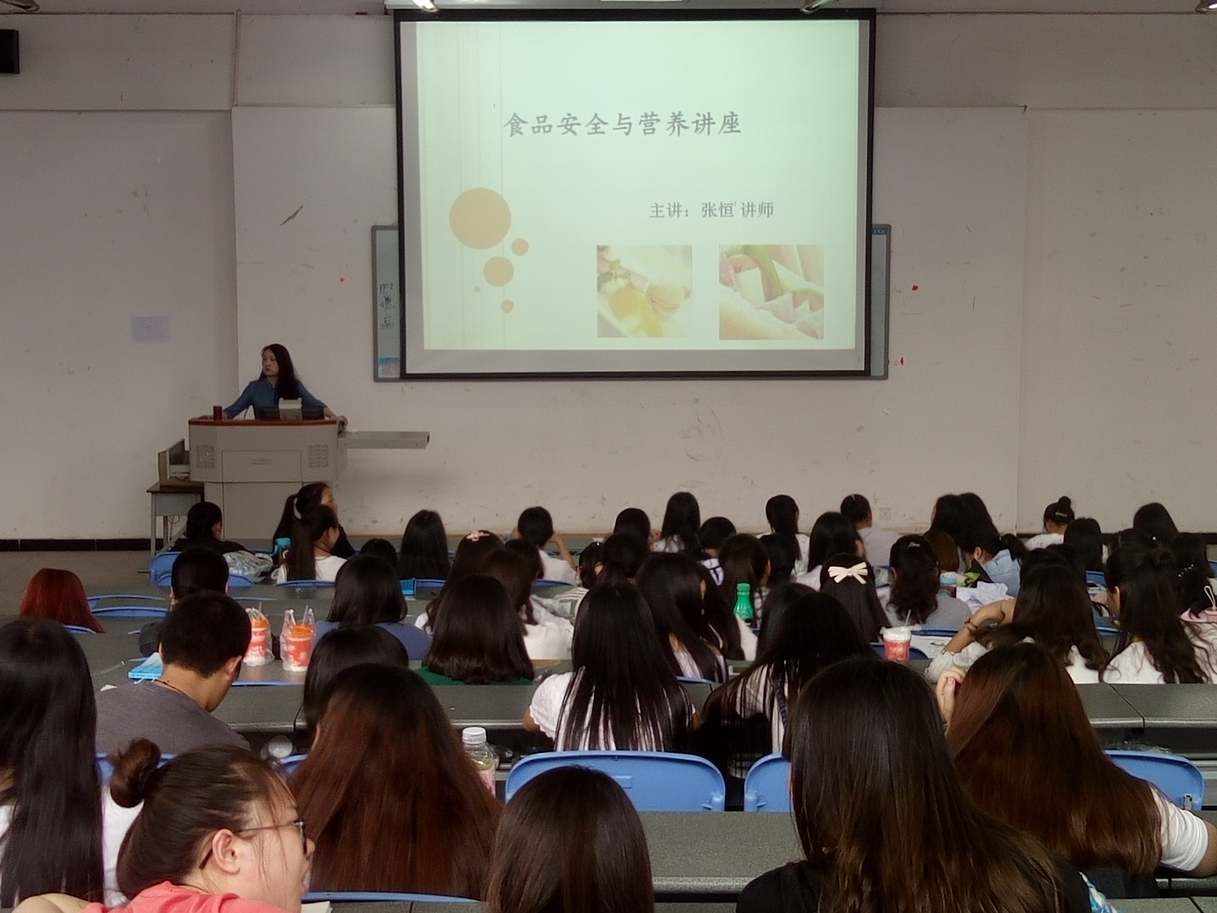 张恒老师通过提问的形式,引导大家科学认识了食品添加剂、食物的酸性与碱性等知识,让大家了解了瘦肉精、染色馒头等食品安全事件。接着,张老师还介绍了食疗、营养搭配、食物排毒、安全食品识别等和生活息息相关的知识,同学们都听得津津有味。最后,老师特别提醒和叮嘱同学们,一定要有食品安全的防范意识,树立科学健康的饮食观,给自己一个健健康康的身体。