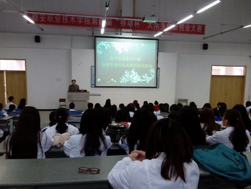 为加强医学生医德医风,培养他们的职业庄严感和责任感,2015年11月23日中午13:00,药学检验系2015级医学生宣誓仪式暨活动宣讲会于青年路校区图书馆阶梯教室101和102成功举行。党支部书记杨泽刚、团总支书记鲜敏、团总支副书记陈静、学生管理干事叶莉莉、各班辅导员老师以及药检系2015级547名新生参加了仪式。